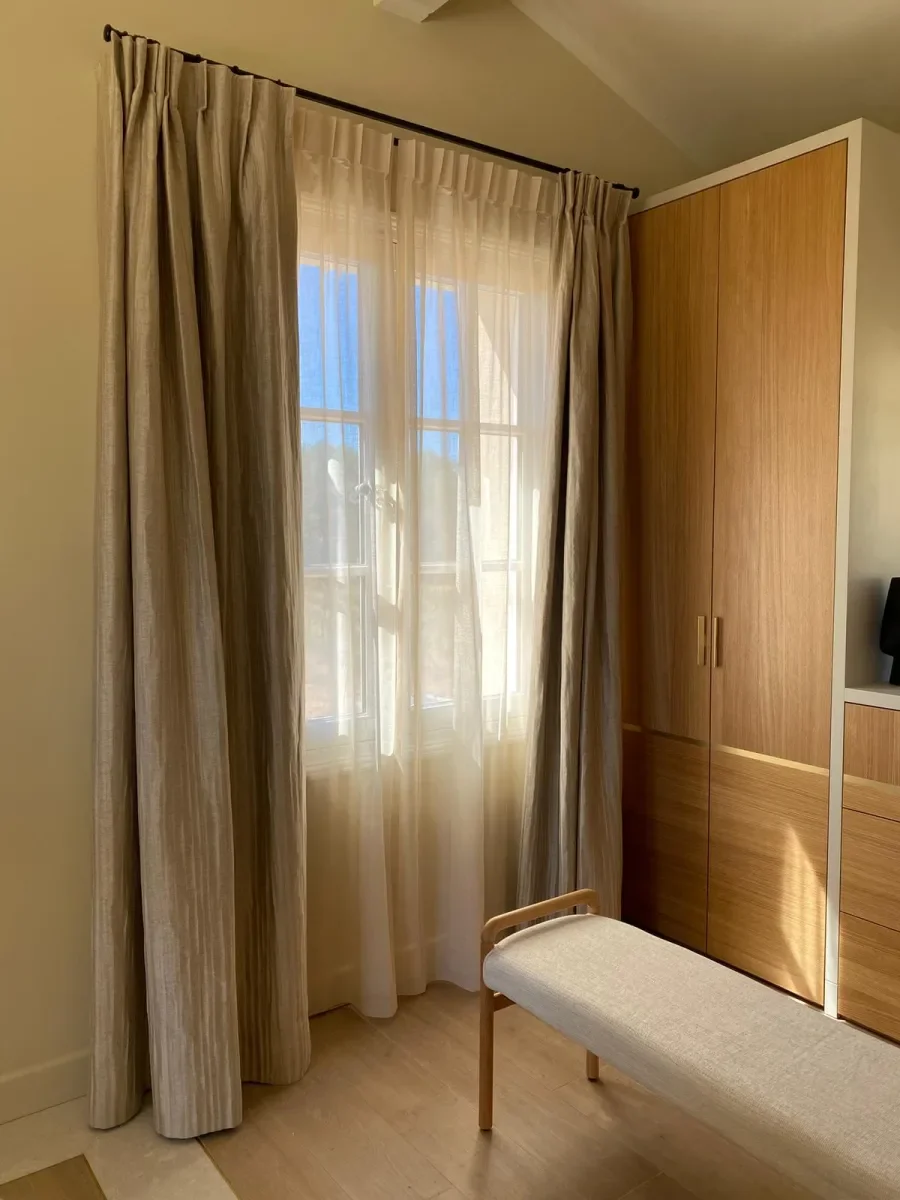 Dans le prolongement de cette philosophie, les propriétaires ont entrepris la rénovation complète d’une maison attenante pour y créer quatre suites haut de gamme. L’ambition était claire : offrir aux visiteurs un confort intimiste tout en préservant l’identité provençale du lieu. C’est dans ce cadre exigeant que nous avons été sollicités pour concevoir et réaliser l’ensemble de l’aménagement textile et décoratif.