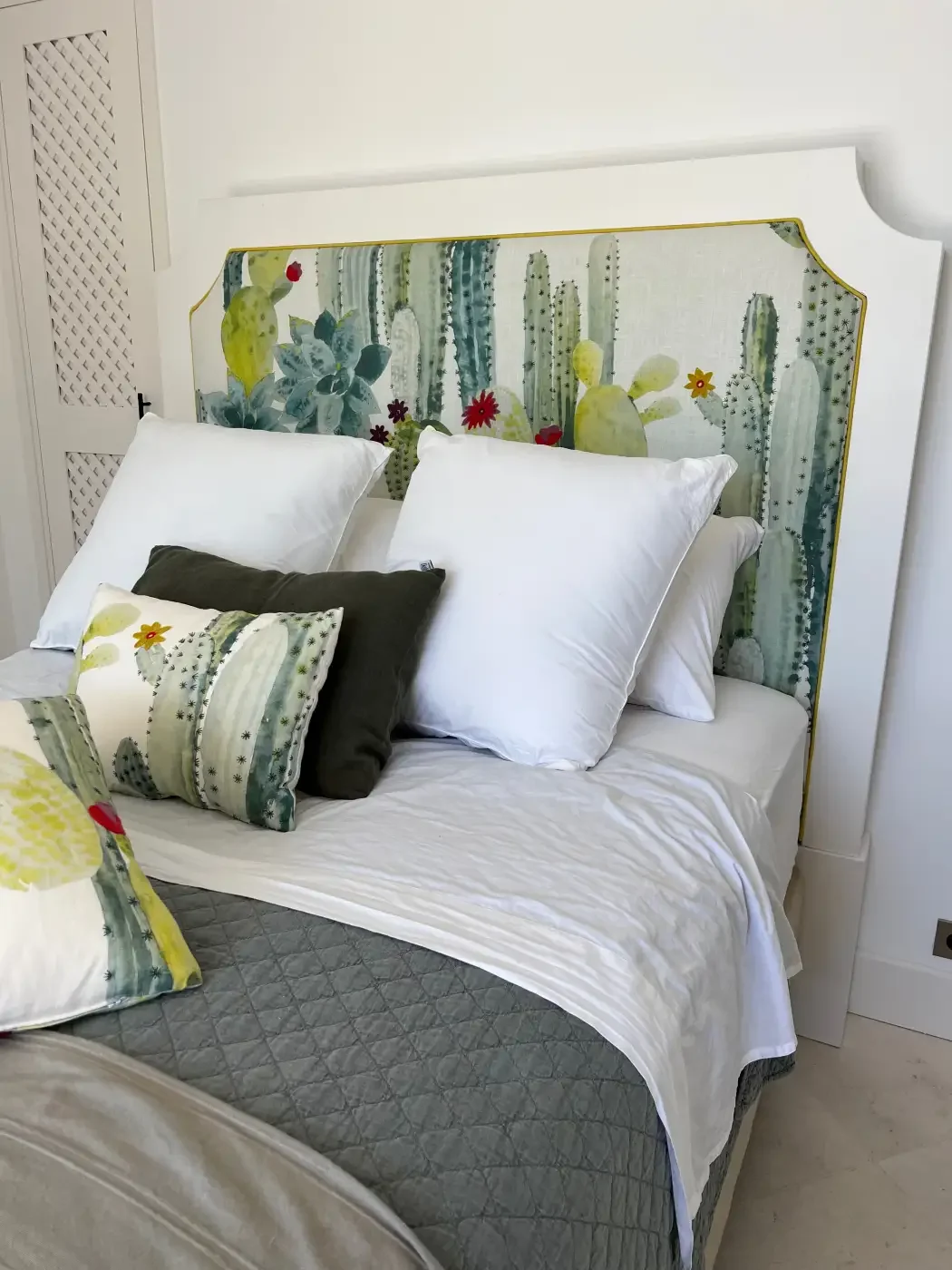 Tête de lit, parure de lit, coussins, rideaux, canapés sur-mesure, banquette et voilages extérieursDans chacune des 10 chambres, le raffinement s’exprime avec délicatesse. L’ambiance décorative s’orchestre autour de têtes de lit dessinées par le cabinet Bosc, inspirées des courbes mauresques et fabriquées sur-mesure dans nos ateliers. Véritables pièces sculpturales, elles mêlent courbes élégantes, motifs raffinés et une touche d’exotisme, évoquant les arches et les ornementations des palais méditerranéens. Pour parfaire le décor, confection pour chaque chambre d’une parure de lit, de coussins et de rideaux avec des tissus sélectionnés parmi les collections de Pierre Frey.